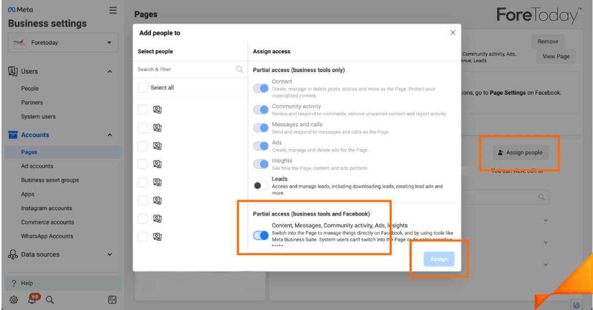 ผู้ใช้งานจะต้องมีสิทธิ์จัดการแบบ full control ภายใน Page ได้อย่างเต็มที่ (โดยผู้ใช้งานสามารถตรวจสอบสิทธิ์การเข้าถึง Page ของตนเองได้ โดยไปที่ Business Setting > Page > เลือกเพจที่ต้องการ > Assign People > เลือกบุคคลที่ต้องการ > เลือก Partial access (business tools and Facebook))