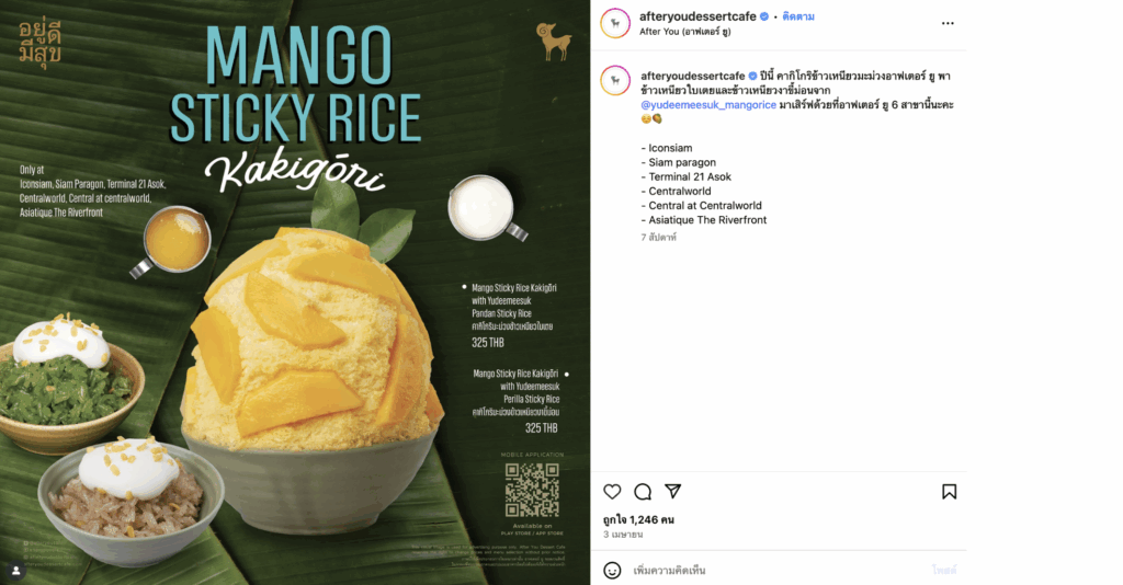 • Kakigori ข้าวเหนียวมะม่วง: เปิดตัวพร้อมกระแสเพลง Mango Sticky Rice จากศิลปิน MILLI บนเวที Coachella ทำให้ทั้งโลกพูดถึงข้าวเหนียวมะม่วง และ After You ใช้โอกาสนี้ปล่อยเมนูที่โดนใจคนไทยและต่างชาติทันที