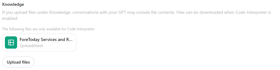 Knowledge Files: ในขั้นตอนนี้จะเป็นการเพิ่มฐานข้อมูลให้กับ GPT ของเรา เพื่อใช้เป็นพื้นฐานความรู้ โดยเราควรจัดการไฟล์เหล่านี้ให้เป็นระเบียบ เพื่อให้เจ้า GPT ของเราอัปเดตและอ้างอิงได้อย่างมีประสิทธิภาพ